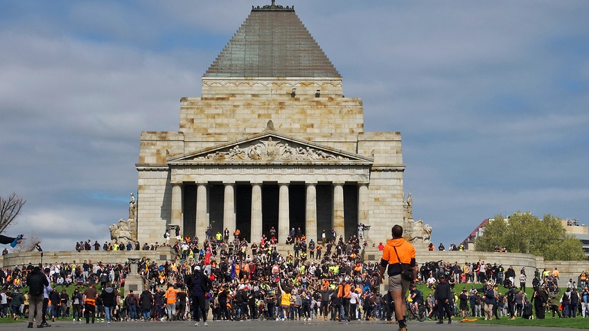 Chanting "every day" from the Shrine of Remembrance, hundreds without masks, some still wearing high-visibility clothing, marched through the city to the war memorial.